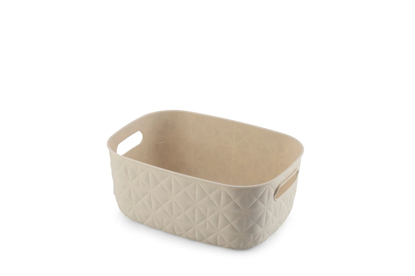 Az 4 literes tárolókosár (S) egy különleges szövési és varrási technikát ötvöz, amely olyan mintázatot hoz létre, amely úgy néz ki, mintha párnázott lenne, így esztétikus és barátságos hangulatot kölcsönöz bármelyik szobának. Ez a kosár ráadásul fenntartható is, mivel 100%-ban újrahasznosított anyagokból készült.