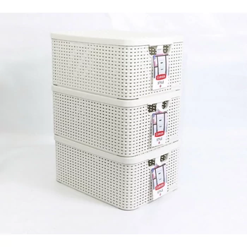 Fehér, műanyag kosár, amely praktikus tárolási megoldásként szolgál, kézreálló fogantyúkkal és légies, rácsozott mintázattal. Ideális nappaliba, fürdőszobába vagy irodába, mérete 35x30x13 cm.